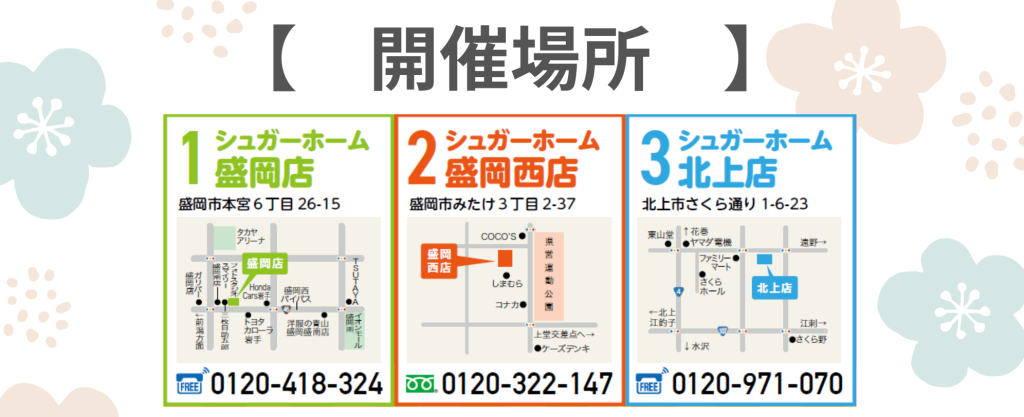 開催店舗 シュガーホーム北上店シュガーホーム盛岡店シュガーホーム盛岡西店
