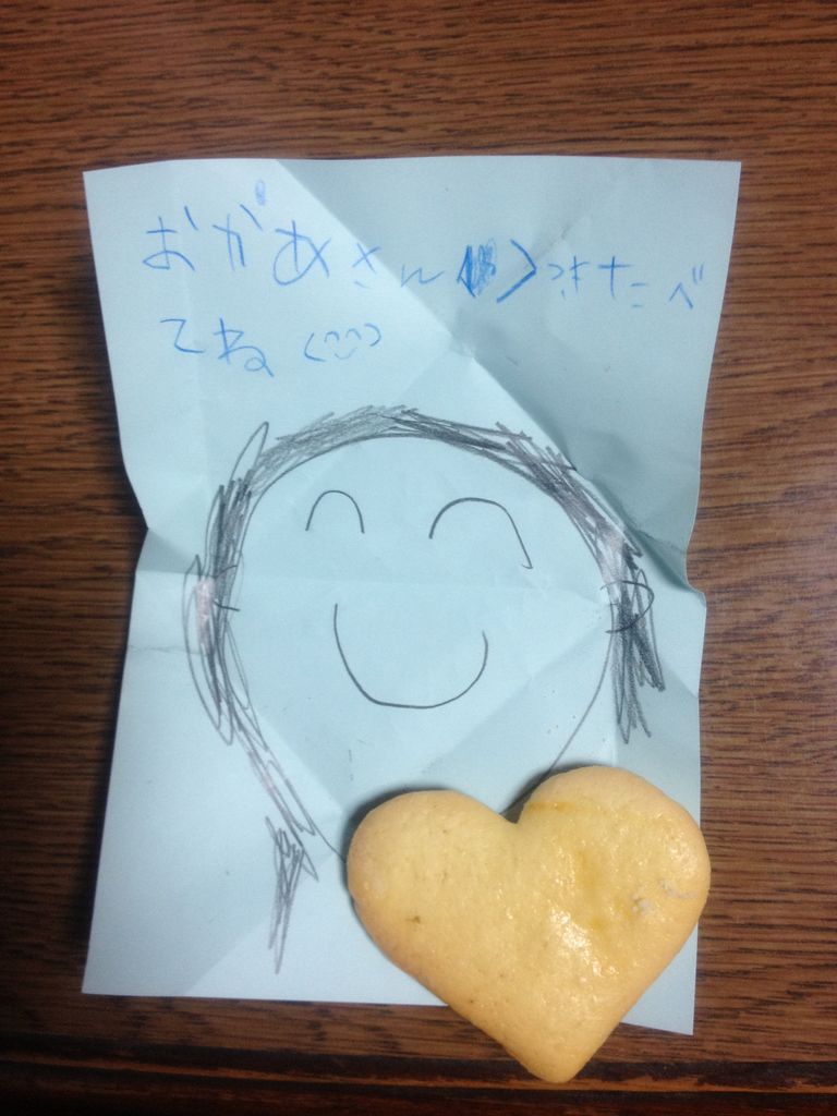 こんにちは!北上店の菊池です。 卒業シーズンですね!息子(6)ももうすぐ卒園。はたしてちゃんと1年生になれるのか、先生の言うことを聞くのか、すご~く心配です。 そんな中、プレゼントをもらいました。保育園で作ったクッキーと手紙。 ハートのかわいいクッキーと私の似顔絵。「く」が逆になっていますが、とてもうれしかったです。 金曜日は卒園式なので、さらに成長を感じるのだろうな、とうれしいようなさびしいような複雑な気持ちでいます。